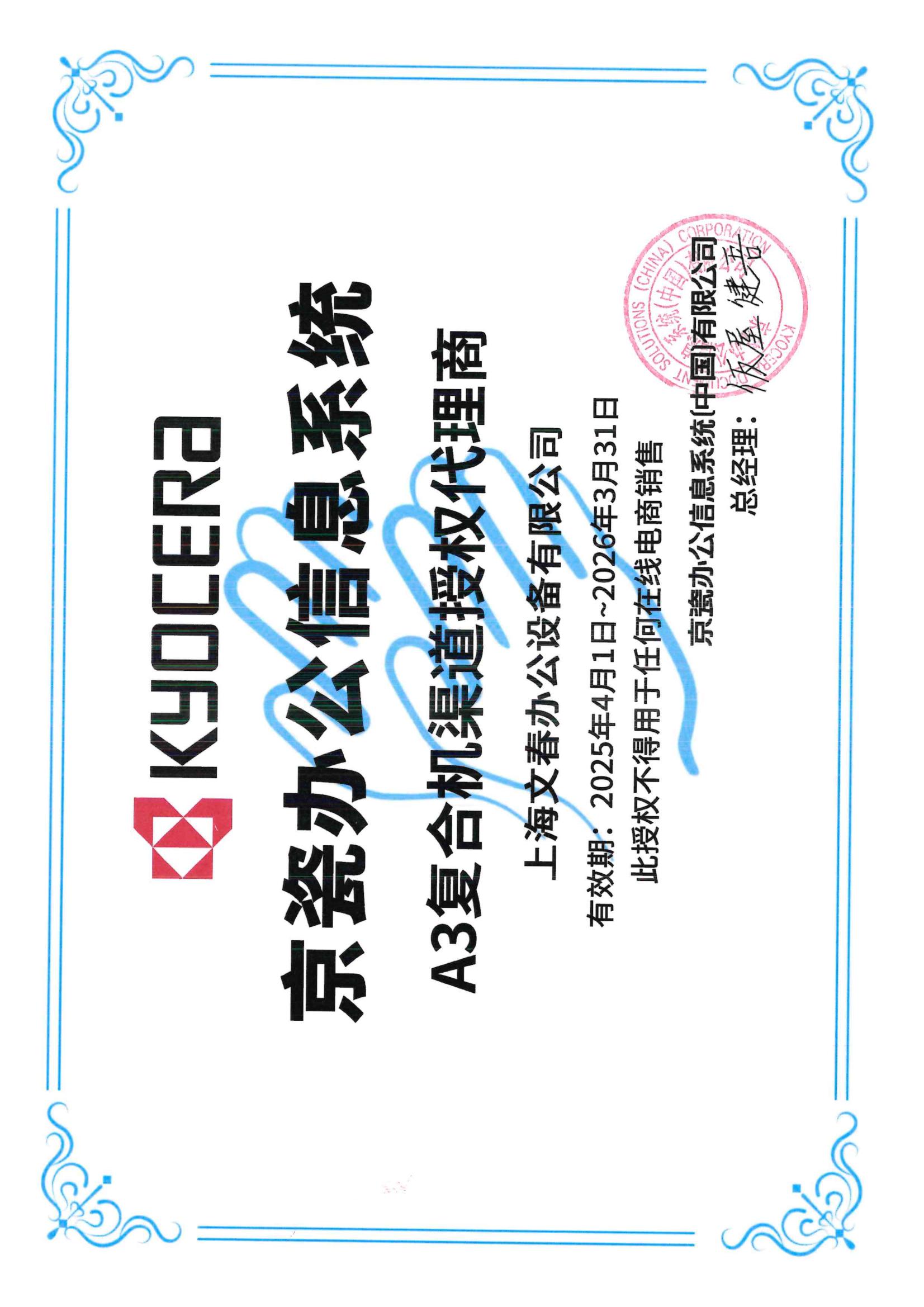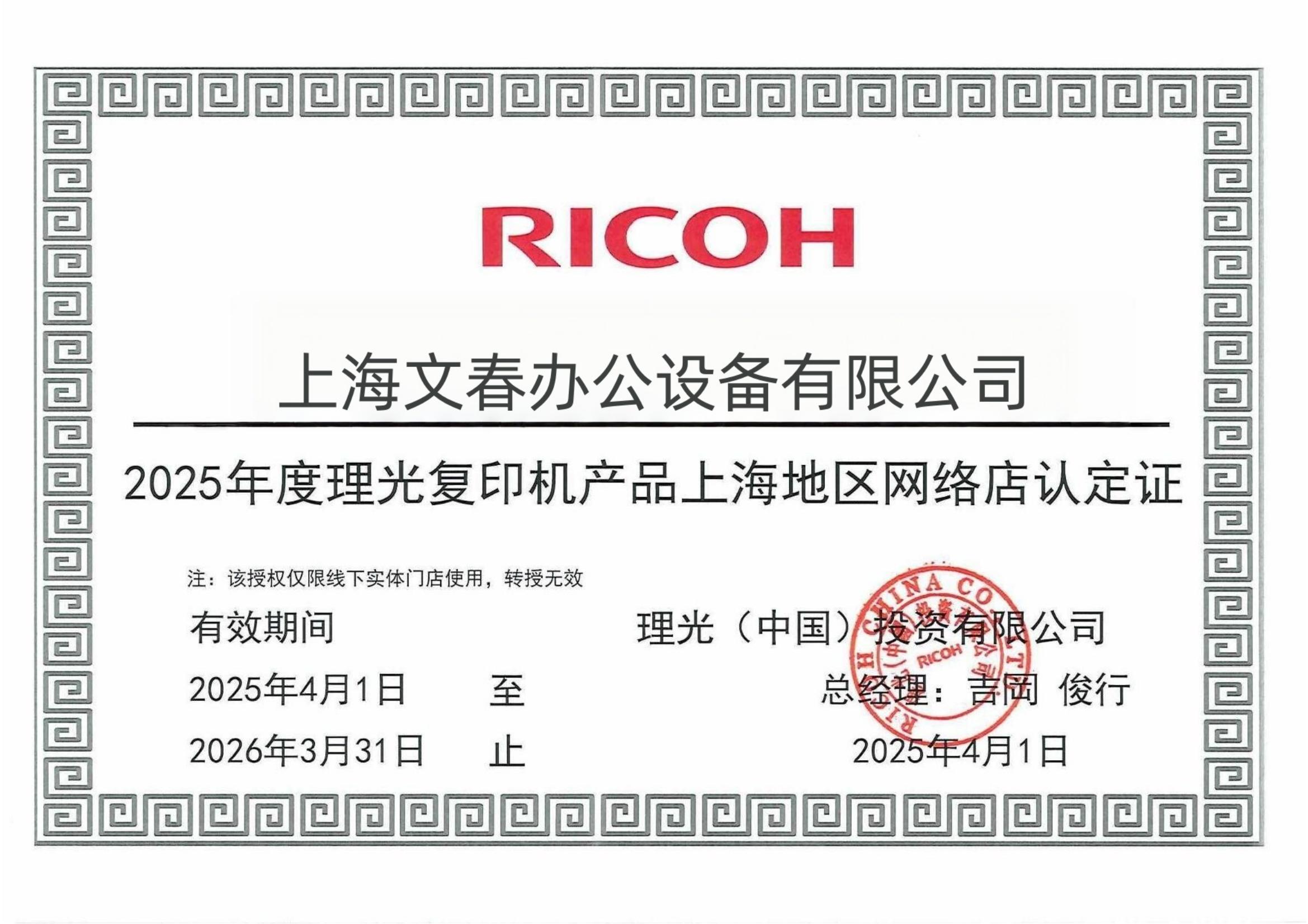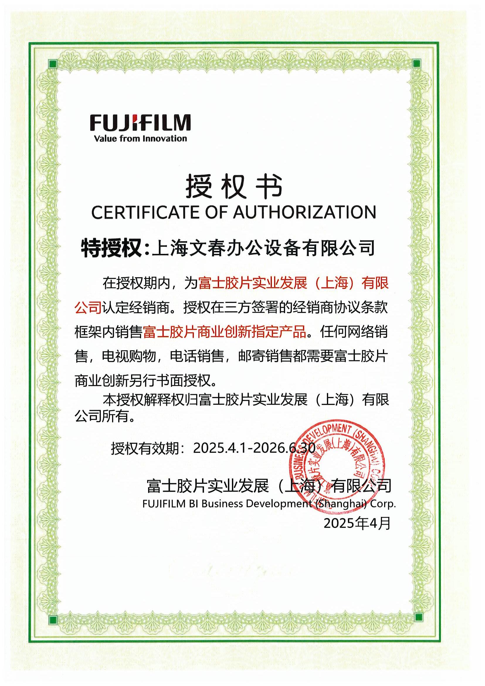 2025年上海文春办公设备有限公司继续获富士胶片、理光、京瓷的授权代理
